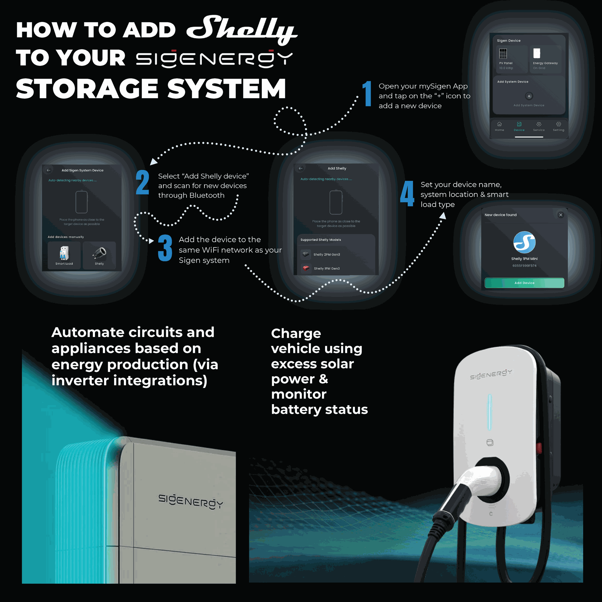 Discover how Shelly products can enhance your Sigenergy installations by integrating them seamlessly with the inverter and registering them to the system on the MySigen app. You’ll learn how Shelly devices can help your customers automate circuits and appliances based on energy production, enable them to charge vehicles using excess solar power, and monitor battery status with ease.